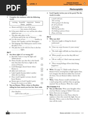 Romeo and juliet activity sheets. WORKSHEETS COMPLETED - MissMO'Brien Romeo Montague is lovesick; his cousin, Benvolio, tries to console him. Paris asks Capulet for Juliet's hand in marriage. Romeo is convinced by Benvolio and later Mercutio to attend a party at the Capulets mansion. Tybalt sees Romeo at the Capulet Mansion and vows revenge. Romeo and Juliet fall in love. PDF Romeo and Juliet - Collaborative Learning Romeo and Juliet: Character Card Activity and Connect Four Game Originally developed with Claudine Field and Mary Ann Apcar in 1992 at Stoke Newington School in Hackney, and piloted in London schools with help from Sabrina Broadbent at the English and Media Centre. Recent revisions and extended English ESL romeo and juliet worksheets - Most downloaded ... English ESL romeo and juliet worksheets - Most downloaded (9 Results) A sequence of text and vocabulary exercises, using an abridged version of Shakespeare's'Romeo and Juliet'. fill in the text of the prologue by watching the film. 13 easy, engaging lessons for Romeo and Juliet This Romeo and Juliet activity would be a great way to get students to revise the play as they go. At the end of each scene, students could do a fun comic-book style photo-booth scene summary that they act out, write dialogue for, and then print and put in a comic-book template.. It would not only be fun, but it would also help students identify the important elements of each scene and ...