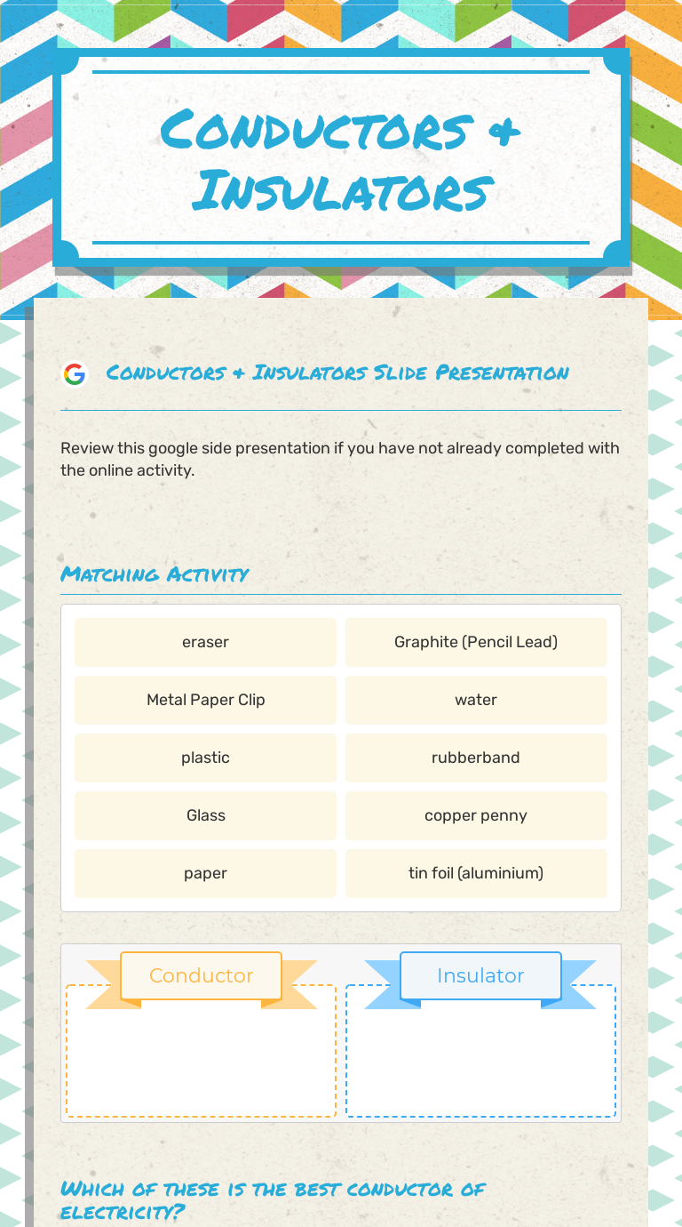PDF Insulators Insulators and Conductors. Explore other TryEngineering lessons at . Lesson Focus Demonstrate the concept of conducting or insulating electricity. Students test a variety of materials in a circuit to determine whether each item behaves as an insulator or a conductor.