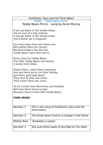 Goldilocks and the three bears story text. PDF Story Goldilocks and the three bears - Wordworks Story Goldilocks and the three bears 4 Once upon a time there were three bears: Father Bear, Mother Bear and Baby Bear. Father Bear was very big. Baby Bear was very small. Mother Bear was not very big and not very small - she was middle sized. The three bears lived in a little house in the forest. Every day the bears ate porridge for breakfast. Goldilocks and the Three Bears - Short Kid Stories By this time the Three Bears thought their porridge would be cool enough; so they came home to breakfast. Now Goldilocks had left the spoon of the Great, Huge Bear standing in his porridge. "SOMEBODY HAS BEEN AT MY PORRIDGE!" said the Great, Huge Bear, in his great, rough, gruff voice. And when the Middle Bear looked at hers, she saw that the spoon was standing in it too. Goldilocks by Roald Dahl Upstairs she goes and tries all three (Here comes the next catastrophe) Most educated people choose To rid themselves of socks and shoes Before they clamber into bed But Goldie didn't give a shred Her filthy shoes were thick with grime And mud and mush and slush and slime Worse still, upon the heel of one Was somehting that a dog had done I say once more, what would you think If all this horrid dirt and stink Was smeared upon your eiderdown By this revolting little clown (The famous story ... 10,000 Top Goldilocks And Three Little BearsSummarizing ... Explore more than 10,000 'Goldilocks And Three Little BearsSummarizing Story Powerpoint' resources for teachers, parents and pupils