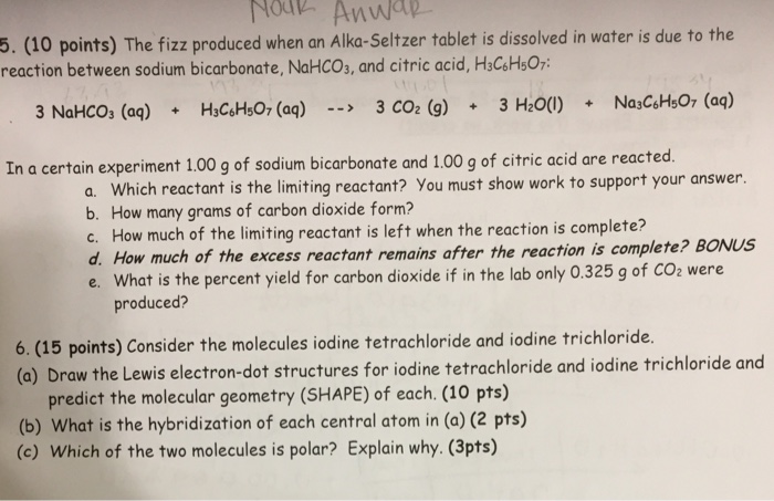 Does Alka Seltzer react with vinegar? - AskingLot.com In Alka-Seltzer, the citric acid mixes with the base, bicarbonate, to form carbon dioxide bubbles. Similarly, why does Alka Seltzer dissolve faster in vinegar? Based on the data gathered, the less concentrated the vinegar solution is, the faster the Alka-Seltzer tablet dissolves. As the vinegar concentrated decreased, the water concentration ... The Alka Seltzer Reaction - Middle School Chemical ... The reaction in this activity involves using sodium bicarbonate and citric acid to produce water and carbon dioxide. Reaction: HCO 3- (aq) + H + (aq) → H 2 O (l) + CO 2 (g) The tablets contain sodium bicarbonate (NaHCO 3) and citric acid. When the tablet is dissolved in water, bicarbonate (HCO 3-) and hydrogen ions (H +) are formed. PDF The Alka-Seltzer Lab! Station 1: Will Alka-Seltzer tablets dissolve faster or slower in carbonated water compared to regular water? Station 2: Will a broken Alka-Seltzer tablet dissolve faster or slower than the whole tablet in carbonated water? Station 3: Does an Alka-Seltzer tablet dissolve differently in a salt water? Station 4: Will Alka-Seltzer tablets dissolve faster or slower in hot water compared to room ... Why does hot water make things dissolve faster ... Why does hot water dissolve Alka Seltzer faster? The second thing learned is the reason why the Alka-Seltzer dissolves in hot water faster than in cold water. The reason is because higher temperatures have higher kinetic molecular energy. This causes the Alka-Seltzer to react faster.