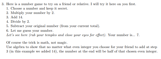 Math trick pick a number. Math Magic - Math Tricks - Kruskal Count Math Magic Trick Want to learn a simple, fun math magic trick that will impress everyone you know? Here's the secret. In the video, Lieber walks viewers through a magic trick where they choose a number on a clock face, then trace around the clock by spelling out their numbers. 49 Math Tricks ideas | math tricks, math, fun math Funny Mind Tricks. Ohio Virtual Academy. Math Trick #3 ~ Follow the steps and your answer should be 15. 1) Think of a number 2) Multiply that... pinned Pick a number from 1-100. Just in your mind. Don't scroll down if you haven'tpicked one. Add you selected number to your age. Multiply it by 2... Amazing Math Trick 9. Phone Number Trick Here is a math trick so unbelievable that it will stump you. 1. First of all, pick the number of times a week that you would like to have sex. (more With this trick, you will be able to multiply any two numbers from 11 to 19 in your head quickly, without the use of a calculator. Prime Numbers: What are They and How to Find Them | Smartick What Are Composite Numbers? Divisors of a Number. Video: Factorization and Prime Numbers. Prime numbers are the numbers that are only divisible by themselves and 1, in other words, if How to Find Prime Numbers. Pay close attention! We are going to give you a trick to know if a number is...