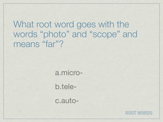 Root Word "tele" Flashcards - Quizlet root word phon. 7 Terms. ashoap. THIS SET IS OFTEN IN FOLDERS WITH... The root word tele-. 9 Terms. ashoap. Lit Links Vocab quiz 5/10/16. 24 Terms.