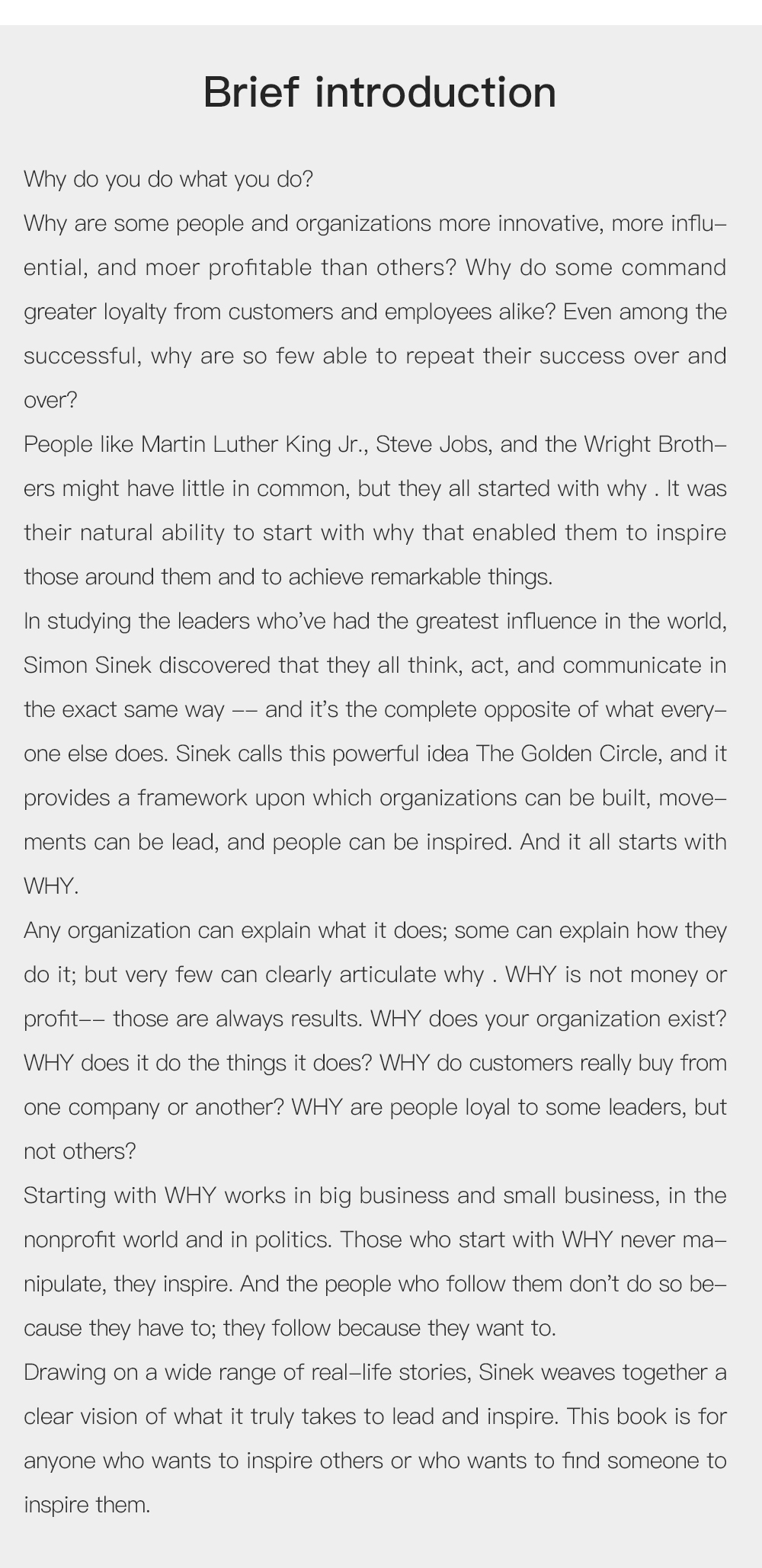 Working with Your Why - Worksheet - Jenn Aubert driving and motiving you that you hadn't consider. I want to start this business/project/empire because________________________________________ ...4 pages Worksheet for Simon Sinek | What's Your “Why” and Where Do ... Unless you begin with the end in mind by starting with why, you will get obsessed with daily metrics. The daily gets us sidetracked from the long game.10 pages Why You Should Start With Why - A Book Review Simon Sinek's book 'Start With Why' seems to have an answer. Why? The answer lies in the public's perception of the company, according to the author. Apple was always considered to be an innovator, and thus, people were willing to try new things made by them. PDF Start With Why Why start with why? This book is about a naturally occurring pattern, a way of thinking, acting and communicating that gives some leaders the ability to inspire those around them. Although these "natural-born leaders" may have come into the world with a predisposition to inspire, the ability is not...