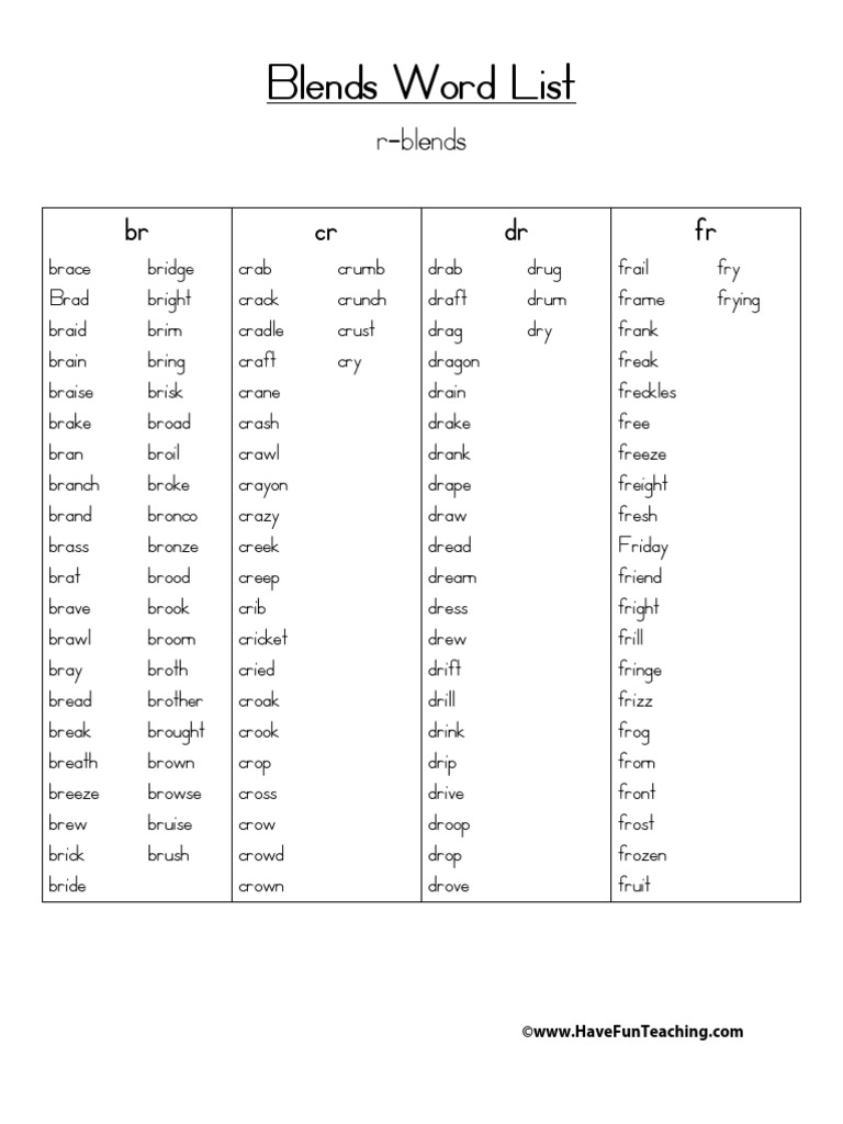 Blends Word List - Have Fun Teaching Blends Word List r-blends br dr druq brace crab ar crumb crunch bridge bright fr fry frying. Brad crack. UM. Ie drab draft drag dragon braid brim cradle.8 pages