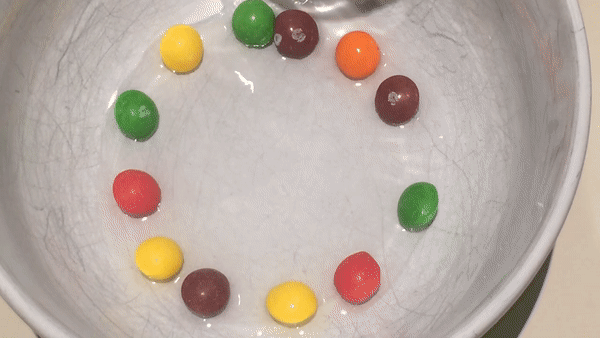 Skittles dissolving in different liquids