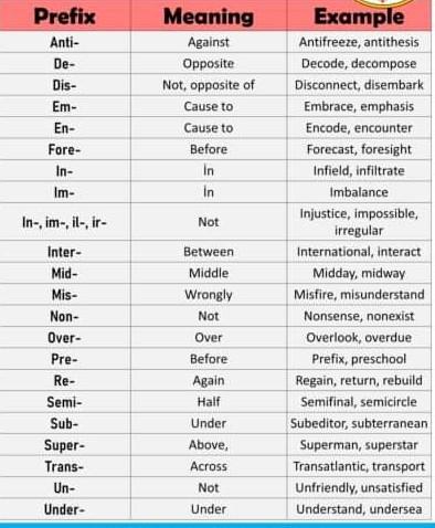 Prefixes: Explanation and Examples - Grammar Monster A prefix is a half word (e.g., anti-, ex-, post-, pre-) added to the front of a word to modify its meaning. Prefixes contrast with suffixes, which are added to the back of a word. Prefixes and suffixes are known as affixes. Easy Examples of Prefixes. micro scope; tri pod; de value; re-establish (Sometimes, a prefix is written with a hyphen ...