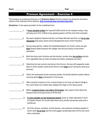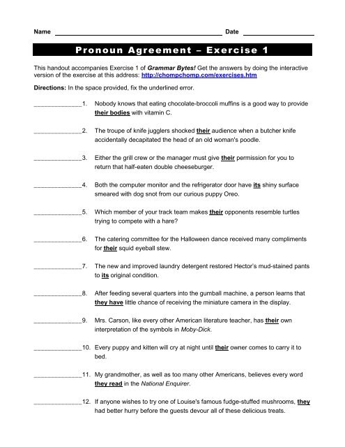 Exercises at Grammar Bytes! Pronoun Agreement. These exercises were created with Hot Potatoes software. Exercise 1. Interactive Exercise; Keep track of your answers with this accompanying handout. Exercise 2. Interactive Exercise; Keep track of your answers with this accompanying handout. Exercise 3. Interactive Exercise udxop.tinate.de › pronoun-agreement-and-referencePronoun agreement and reference exercises - udxop.tinate.de Online Writing Lab - Pronoun-Antecedent Agreement, Exercise 2 Pronoun/Antecedent Agreement Practice 2. Remember: 1. Neither, either, and each are singular. 2. Words ending in "one," "body," and "thing" are also singular. 3. A collective noun is singular if the group acts as one unit, plural if the members of the group act as individuals. Pronoun-Antecedent Agreement - Lewis-Palmer School District 38 EXERCISE 14: Pronoun/Antecedent Agreement Directions: In each sentence, circle the correct pronoun. Also underline its antecedent. If its antecedent is a pronoun that can be either singular or plural, underline twice the word that indicates its number in the sentence. 1) All of the mineral water has lost (its, their) sparkle.