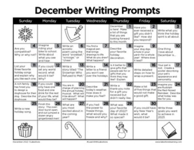 31 Fun December Writing Prompts • JournalBuddies.com December Writing Prompts: 31 Holiday Journal Ideas Think of a holiday tradition that you don't understand. Write a story that explains where it came from. Write a poem about winter. How does the air feel? What sounds do you hear? What winter holidays does your family celebrate? Do you have friends who celebrate other holidays?