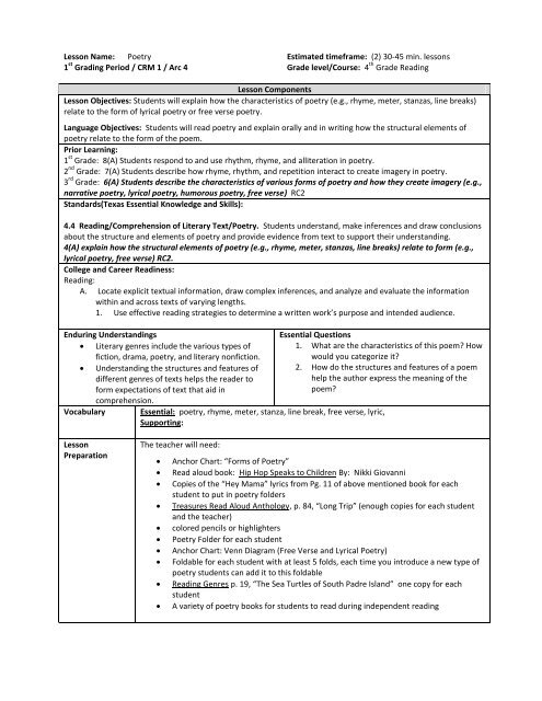 Poetry lesson plans 5th grade. List of All 180 Poems | Poetry 180 | Poet Laureate Projects |... List of All 180 Poems Poem Poem 001: Introduction to Poetry Contributor: Collins, Billy Poem Poem 002: The Good Life Contributor: Smith, Tracy K. Poem Poem 003: Abecedarian Requiring Further Examination of Anglikan Seraphym Subjugation of a Wild Indian Rezervation Contributor: Diaz, Natalie Poem Poem 004: Question Contributor: Swenson, May Poem 20 Free Poetry Contests to enter in 2023 Nov 4, 2022 · Submission requirements: The poetry contest is open to residents of Iowa. Poets and fiction writers who have published no more than one full-length book in the genre in which they are applying are eligible. 7 to 10 pages of poetry are accepted. Payment: Two prizes of $500 each are awarded annually to a poet and a fiction writer from a select state. Each winner will also receive a monthlong residency at the Jentel Artist Residency Program in Wyoming and will meet with writers, editors ... Poetry - Wikipedia A poem is a literary composition, written by a poet, using this principle. Poetry has a long and varied history, evolving differentially across the globe. It dates back at least to prehistoric times with hunting poetry in Africa and to panegyric and elegiac court poetry of the empires of the Nile, Niger, and Volta River valleys. [4] Poetry | Academy of American Poets Poetry is a form of writing vital to culture, art, and life. From A Poet’s Glossary. The following definition of the term poetry is reprinted from A Poet’s Glossary by Edward Hirsch. An inexplicable (though not incomprehensible) event in language; an experience through words.