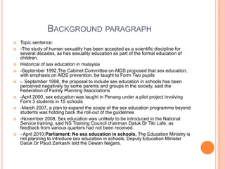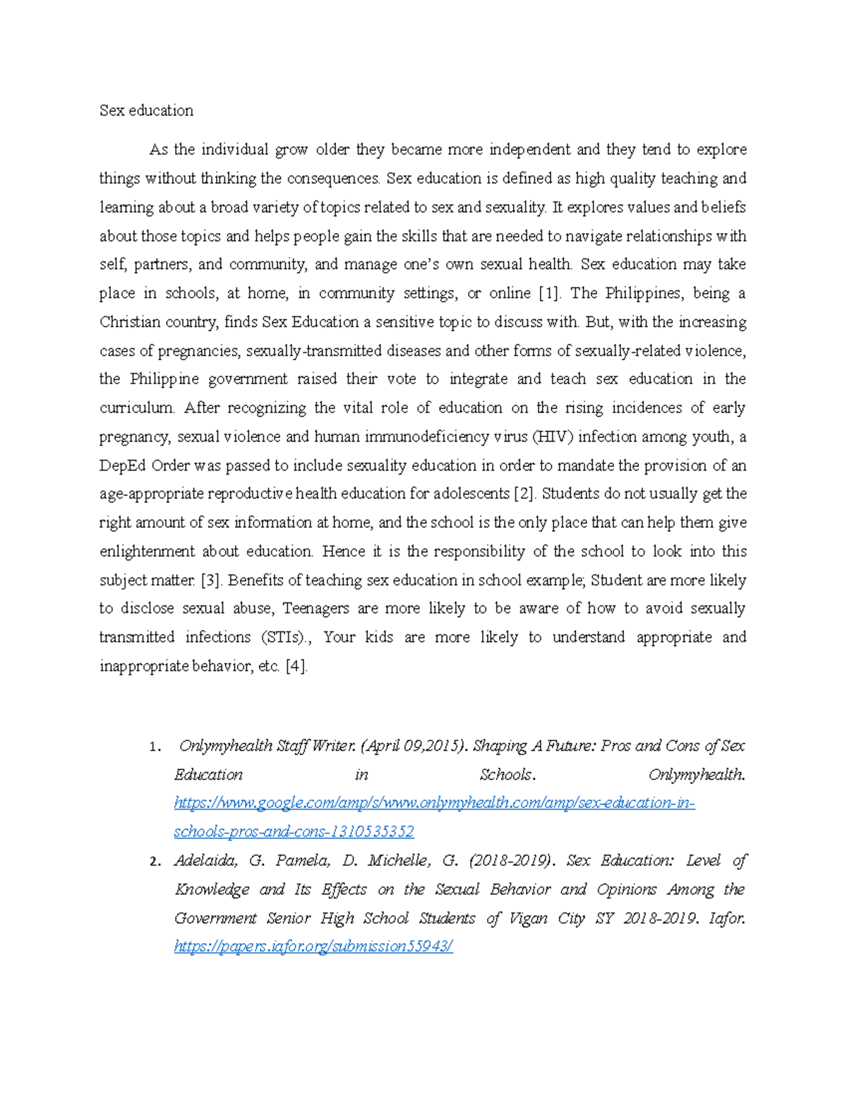 (PDF) Sex Education- Pros and Cons - ResearchGate Authors: Anna Emmanouil University of Thessaly Abstract It is related with Sex Education a new section about education. Sex education, to a large extent, involves all educational...