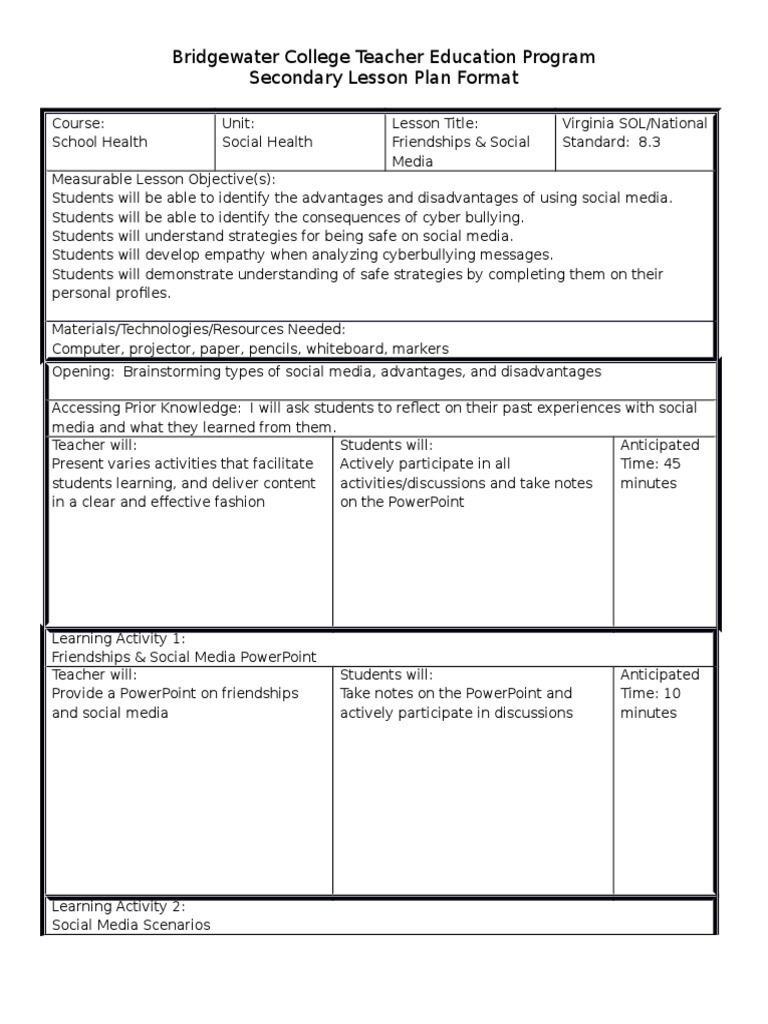 3 Best Places to Find Social Media Lesson Plans for Middle School Social Media Lesson Plans on Teachers Pay Teachers Teachers Pay Teachers (TpT) is an online marketplace where teachers can share, sell, and buy resources like lesson plans and activities from each other. Some of the best resources on TpT for teaching middle school students about social media include: › classroom-resources › lessonsSocial Media for Social Action | Learning for Justice This lesson will engage students in the debate about the efficacy of social media as a tool for social change. While some researchers and activists have written about the empowering effects of online social engagement, others critique the limits of what some people have coined armchair activism, clicktivism or slacktivism. Students will explore ... Social Media Lesson Plan | PDF | Social Media - Scribd Social Media: An Introduction Social Networks, Blogs, Microblogs, and Protecting Your Privacy and Digital Reputation Lesson Plan by Amy Craig & Eric Kleppen I. Introduce topic (4 minutes total) a. The importance of social media i. Today we're going to talk about social media because understanding how to use social networking tools is becoming