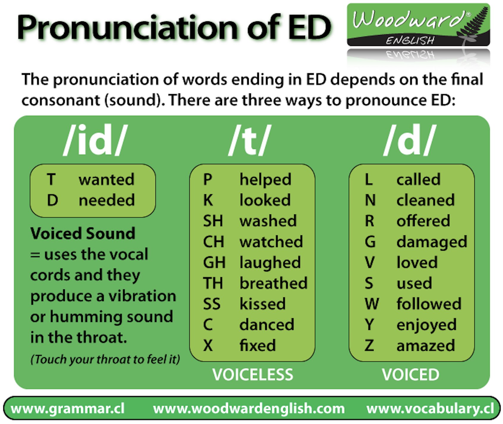 Pronunciation of ED Endings [ /t/ /d/ /ed/] - EnglishPost.org Jan 24, 2023 · If the verb base ends in a voiceless sound, then the –ed ending sounds like “t”. Voiceless consonants are: p, f, k, s, sh, ch, th Pronunciation of ED Endings: Rule #2 If the verb base ends in a voiced sound, then the –ed ending sounds like “d”. Voiceless consonats are: b, v, g, z, j, th, l, m, n, r Pronunciation of ED Endings: Rule #3 Words that end in ed | Words ending in ed - TheFreeDictionary.com 15-letter words that end in ed underprivileg ed unsubstantiat ed unsophisticat ed polyunsaturat ed undistinguish ed monounsaturat ed unreconstruct ed overrepresent ed overconstruct ed counterpicket ed counterweight ed overcompensat ed interpenetrat ed overexaggerat ed overaccentuat ed transparentiz ed photosensitiz ed hypersensitiz ed