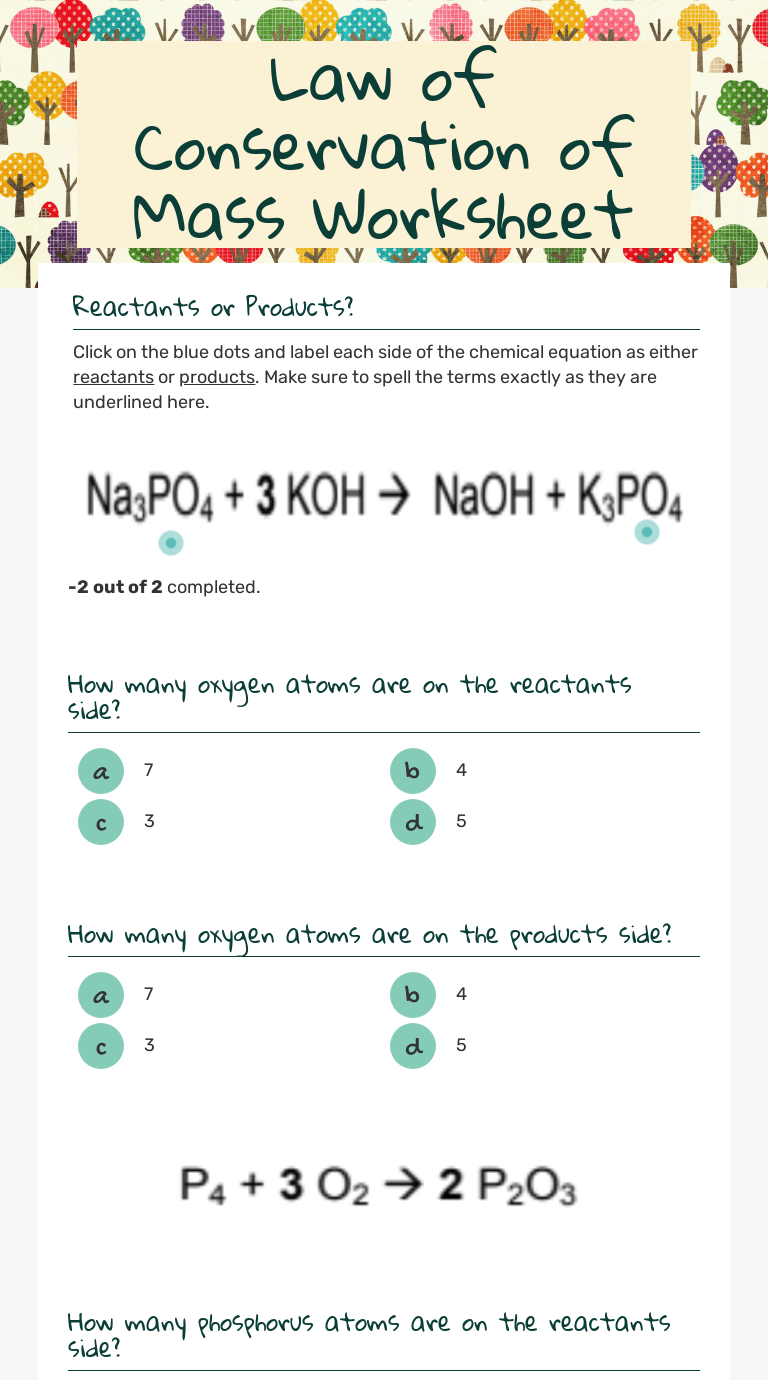 Conservation of mass worksheet. Conservation of Mass Worksheet Key - University of South Florida substance by a mass equal to the amount of oxygen that reacted with the substance. These experiments led to what is currently known as The Law of Conservation of Mass. This law states that mass can neither be created nor destroyed. It can only be converted from one form to another. Conservation of mass - BBC Bitesize Conservation of mass Working scientifically. Maths skills are often used in science. We often need to make equations and do calculations. In... The mass of a gas. It isn't easy to measure the mass of a gas, and it may seem as though gases don't weigh anything, but... Test your knowledge. Conservation of Mass Worksheet - arrsd.org substance by a mass equal to the amount of oxygen that reacted with the substance. These experiments led to what is currently known as The Law of Conservation of Mass. This law states that mass can neither be created nor destroyed. It can only be converted from one form to another. Lesson Worksheet:Conservation of Mass | Nagwa In this worksheet, we will practice using the law of conservation of mass to calculate the masses of reactants and products in a chemical reaction. Q1: Antoine Lavoisier was one of the first scientists to state the law of conservation of mass.