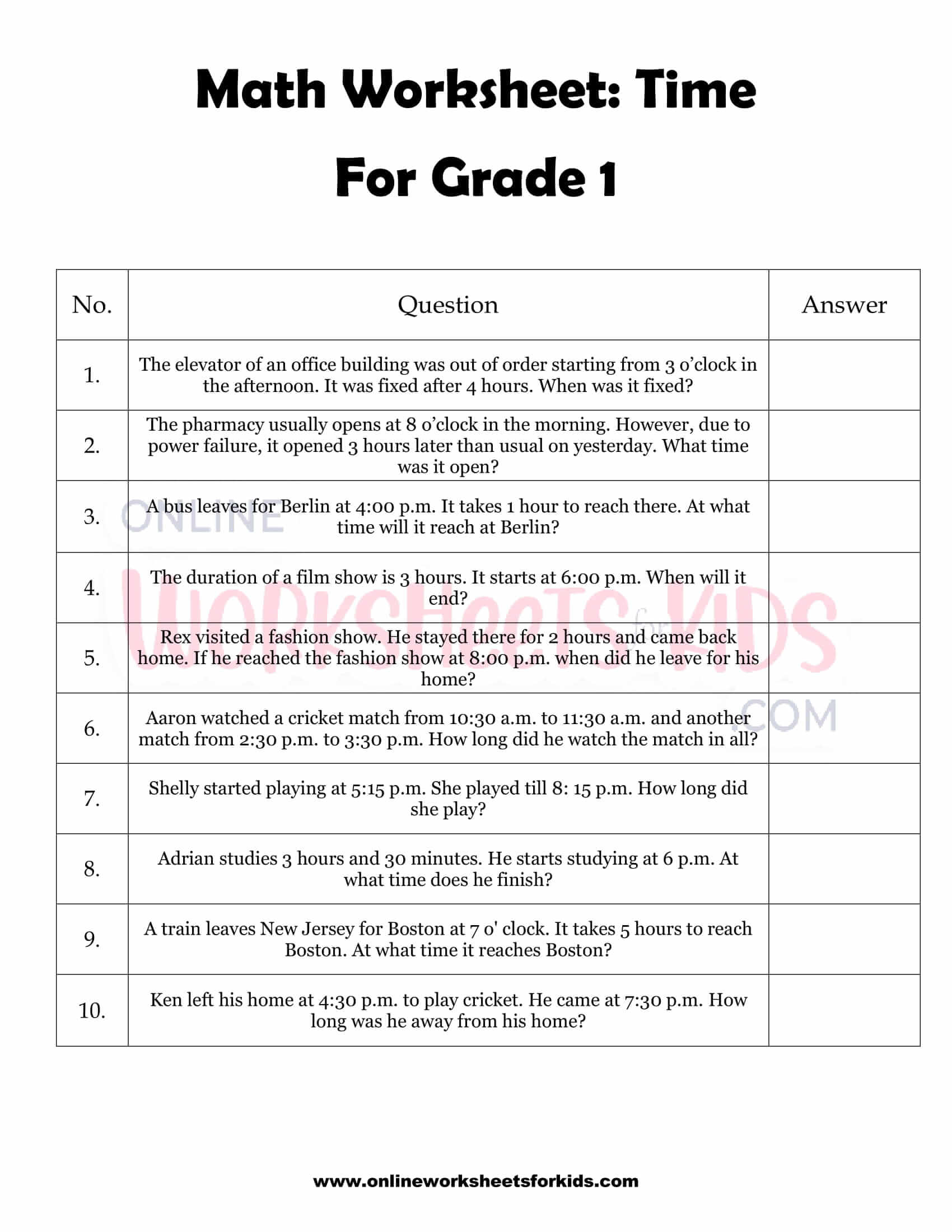 Time word problem worksheets for grade 1 | K5 Learning Time word problems Whole hours word problems In these grade 1 word problems, students are asked how much time has elapsed between two times, or what time will it be in a certain number of hours. All times are in whole hours. Worksheet #1 Worksheet #2 Worksheet #3 Worksheet #4 Worksheet #5 Worksheet #6 Similar: