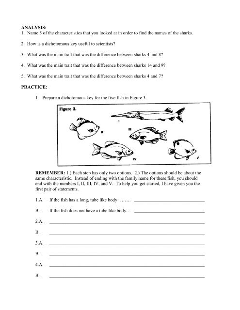 Using Dichotomous Keys - Teachers (U.S. National Park Service) A dichotomous key is an important scientific tool, used to identify different organisms, based the organism's observable traits. Dichotomous keys consist of a series of statements with two choices in each step that will lead users to the correct identification. Answers Using And Making A Biological Key Answers Using And Making A Biological Key what you with to read! Paul A. Rees 2020-08-14 Learning Technologies for Transforming Large-Scale Teaching, Learning, and Assessment - Demetrios Sampson This volume provides a contemporary glance at the drastically expanding field of delivering large-scale education to unprecedented numbers of learners. Classifying Sharks using a Dichotomous Key Classifying Sharks using a Dichotomous Key. A classification system is a way of separating a large group of closely related organisms. making and using a biological key answers - DwayneMiddleto1's blog USING AND MAKING A DICHOTOMOUS KEY (Adapted from Using and Making a Biological Key). the key or try to work backwards, you could get a wrong answer. Answer A biological key is kind of like a list of questions. When answering the questions you can figure out the classification (kingdom, phylu, class, and order) of.
