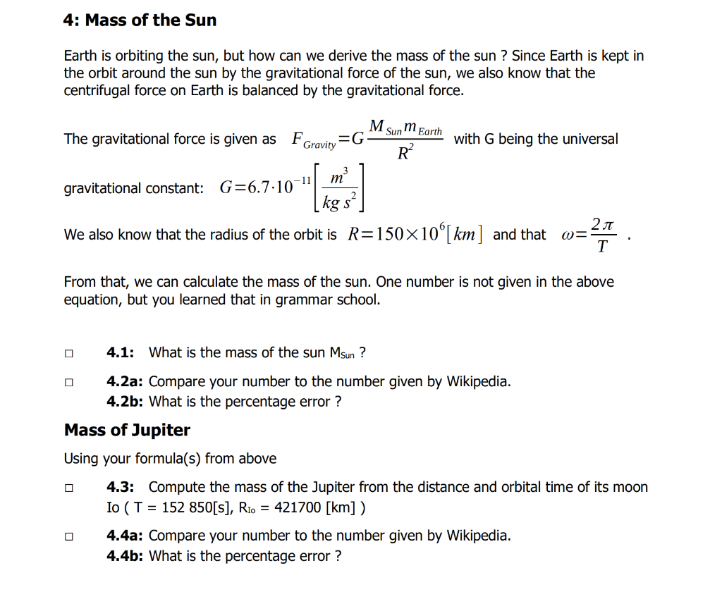 How to calculate mass of the sun? Please tell in a simple ... - Toppr Putting the values into the equation gives the mass of the Sun: M=1. How to calculate the mass of the sun using centripetal force and ... Sep 2, 2019 ... Requested video to find the mass of the sun. Used the concept of circular orbits, centripetal force, and Newton's law of gravitation.