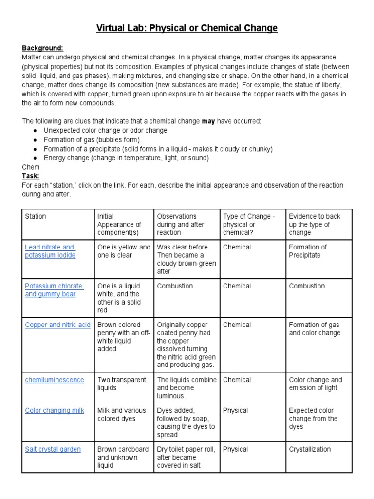 Physical vs chemical changes worksheet answer key