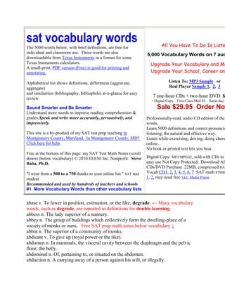 100 Top "SAT" Words - Vocabulary List | Vocabulary.com Full list of words from this list: words only definitions & notes abate abdicate aberration abstain adversity aesthetic amicable anachronistic arid asylum benevolent bias boisterous brazen brusque camaraderie canny capacious capitulate clairvoyant collaborate compassion compromise condescending conditional conformist conundrum convergence Introducing Vocabulary.com's New SAT Test Prep Program Students, tutors, and teachers who've loved Vocabulary.com have been asking us for a new kind of test-prep solution — one that combines our research-based approach to language instruction with word lists specifically created for the SAT and PSAT. You also wanted a structured yet flexible program that makes it easy for students to follow at ... The Vocabulary.com Top 1000 - Vocabulary List | Vocabulary.com The Vocabulary.com Top 1000 The top 1,000 vocabulary words have been carefully chosen to represent difficult but common words that appear in everyday academic and business writing. These words are also the most likely to appear on the SAT, ACT, GRE, and ToEFL.