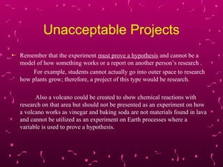 What is the hypothesis for a volcano science project? - Answers A hypothesis for a science project is a proposed explanation made on limited evidence as a starting point for the investigation. The best hypothesis for a science project of a lava lamp... Writing a Hypothesis for Your Science Fair Project A hypothesis is a tentative, testable answer to a scientific question. Once a scientist has a scientific question she is interested in, the scientist reads up to find out what is already known on the topic. Then she uses that information to form a tentative answer to her scientific question. Sometimes people refer to the tentative answer as "an ... Look Inside a Volcano Science Experiments Project for Kids Take building a classic volcano experiments for kids to whole new level with this volcano science project where your kids can actually see what happens INSIDE the volcano during an erruption! This volcano project ideas is perfect for preschool, pre-k, kindergarten, first grade, 2nd grade, 3rd grade, 4th grade, 5th grade, and 6th grade students.